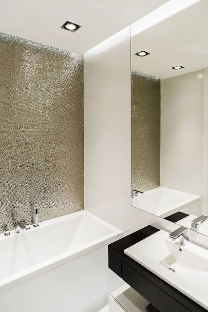 Ostatnio, całkiem przypadkiem trafiłam na zdjęcia metamorfozy pewnej łazienki. Oczywiście cała wyglądała przepięknie, ale moją uwagę szczególnie przykuły biało-srebrne płytki w postaci małych rombów. I pomyślałam sobie, że takie błyszczące płytki to doskonały pomysł na rozświetlenie na przykład małych łazienek lub kuchni. Wydaje mi się, że komponowałyby się dobrze z każdym kolorem mebli, a zwłaszcza z białym. Sięgnęłam więc po garść inspiracji, które zebrałam w tym poście. U nas w domu znajdować będą się dwie łazienki, w tym jedna mała bez okien, więc oczami wyobraźni już widzę ją ubraną w takie właśnie połyskujące akcenty. Na drugim zdjęciu widać, że srebrne płytki potrafią ozdobić nawet takie proste pomieszczenie jak pralnia. Coś wspaniałego. Uwielbiam natrafiać na takie inspiracje, ponieważ natychmiast działają na moją wyobraźnię i przekładam je na wizję naszego domu.
