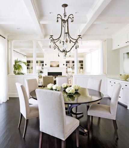 A dziś kilka słów o stole w jadalni. Chciałabym skupić się na stole okrągłym, ponieważ właśnie taki widziałabym w naszej jadalni, a właściwie w kącie jadalnianym połączonym z pokojem dziennym. Cała ta przestrzeń to około 32 metry kwadratowe, więc raczej nie będziemy mogli poszaleć z umieszczeniem bardzo dużego stołu. Wydaje mi się, że stół okrągły dobrze zagospodaruje tą niewielką przestrzeń i dodatkowo nada wnętrzu elegancji. Wystrój oczywiście będzie jasny, więc w celu zapobiegnięcia monotonii postaram się wybrać stół drewniany w ciemnobrązowym kolorze. Do tego miękkie krzesła z nogami w kolorze stołu, ale obite jasną tapicerką (do wyboru prawdopodobnie beż, szarość lub jasne pastele z białymi wzorami). A jako dopełnienie wisząca lampa (najlepiej w formie lampionu), również z ciemnymi akcentami, które będą pięknie kontrastowały z jasnym wystrojem okien. Ah, już mam przed oczami ten widok...
